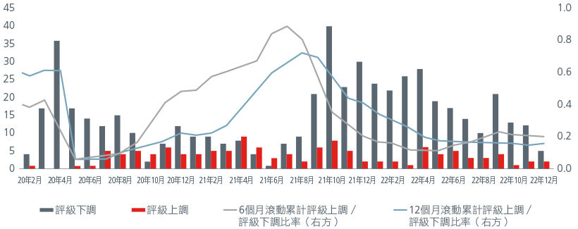 圖1. 亞洲高收益債券企業的滾動6個月及12個月評級行動趨勢