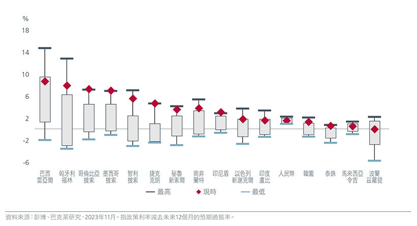 為了遏抑通脹,拉丁美洲國家在2021年3月啟動貨幣緊縮週期,較美國早了一年。智利及墨西哥的利率曾上升至11.25%,巴西的利率則上升至13.75%,票息因此有所增加。由於早於美國採取行動,智利及巴西能夠減慢通脹,其各自央行因此能夠在2023年下半年開始放寬政策。隨著利率下調,資本收益提高了整體債券回報。雖然拉丁美洲仍然在對抗通脹,但一旦聯儲局開始放寬政策,該地區的減息步伐應在年內加快。此外,在過去兩年大幅收緊貨幣政策後,拉丁美洲央行可能希望實現利率正常化。