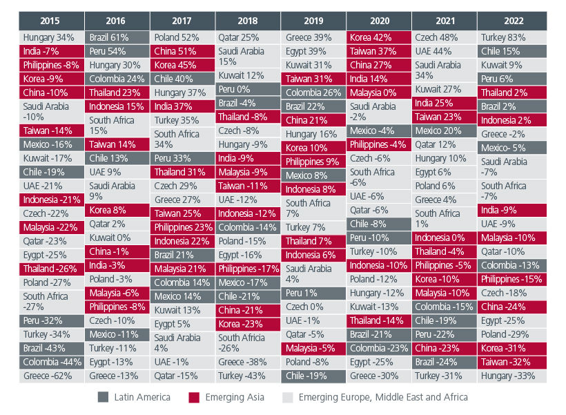 A wider opportunity set provides a larger universe for the discovery of mispriced companies, which can positively impact returns over the long term. Our quest to identify the most promising companies within the GEMs often lead us outside of Emerging Asia to other emerging regions such as Emerging Europe, Middle East and Africa (EMEA) as well as Latin America. Fig. 1. shows that there have been instances when the markets in these regions have delivered strong returns, and that opportunities shift across geographies over time.