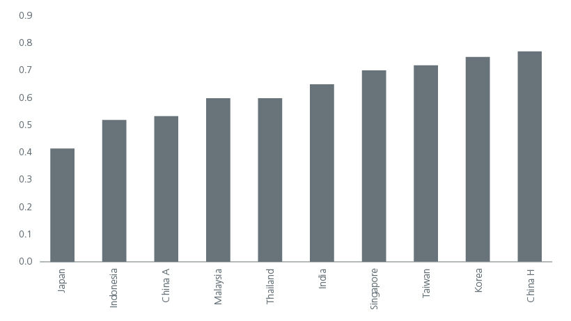 For Asian investors who have large exposures to their domestic markets, it is worth noting that the equity markets in Japan, Indonesia, China, Malaysia, and Thailand have the lowest correlations (<0.6) to the MSCI EM Index. Fig. 3. Hence, a broader GEM allocation can provide significant diversification to investors from these countries. In terms of sector exposures when compared against the MSCI EM Index, the Singapore, Malaysia, and Indonesia markets have higher exposures to financials while the Korea and Taiwan markets have a clear technology bias.