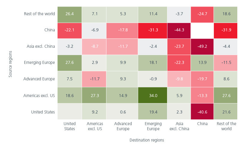 The reallocation of Foreign Direct Investments (FDI) flows arising from the global supply chain shifts will be uneven and create winners and losers2 . Geopolitical tensions and more inward-looking policies globally have seen FDI to and from China decline, although the persistent effect of the COVID-19 pandemic and prolonged lockdowns may have also contributed. The bottom row of Fig. 5 shows that Latin America and Emerging Europe have been beneficiaries of outward FDI from the US. FDI inflows is important for the emerging economies as it can create jobs and encourage capital formation, as well as bring about technologies and productivity enhancing management practices. This should have a positive spill over impact on the economies and companies.