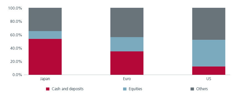 Japan’s high savings rate is renowned. More than half of Japanese household assets are held in cash and deposits. Allocation to other financial assets remains low compared to its developed market counterparts.