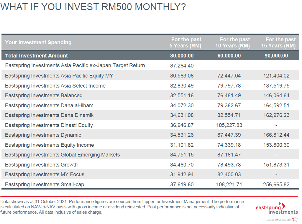 You might be skeptical about how a minimal amount of RM100 per month can potentailly reap rewards, but when the markets are uncertain, investing a smaller amount puts you at less risk of loss. Plus, if you start early, you may potentially reap more rewards as the years go by. However, with Eastspring Investments Regular Investment Choice (“RICh”) Fund (“Fund”), you don’t have to worry about the timing of the market as the fund manager will balance out the portfolio for you based on the market movements.