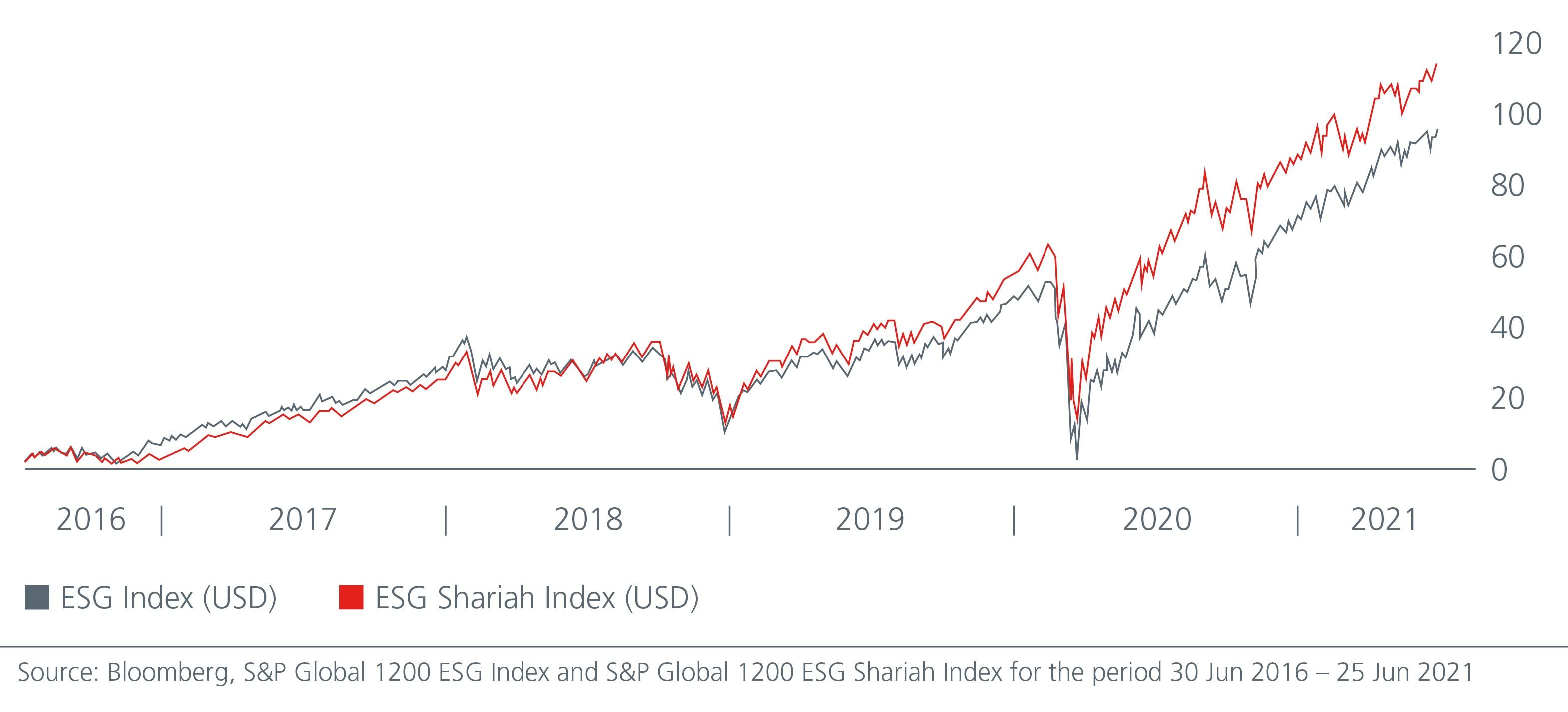Another study that constructed portfolios based on the global equities’ universe of 2,500 stocks with both ESG and Shariah screens found that by applying the ESG screen, the ESG compliant universe decreased to 850 stocks, of which 50 -70 stocks were chosen to be in the ESG portfolio. Meanwhile the Shariah plus ESG screen portfolio had 30-50 stocks filtered from a smaller universe of 350 stocks. The outcome from this study found that both portfolios had broadly correlated performance over a 5-year period.6