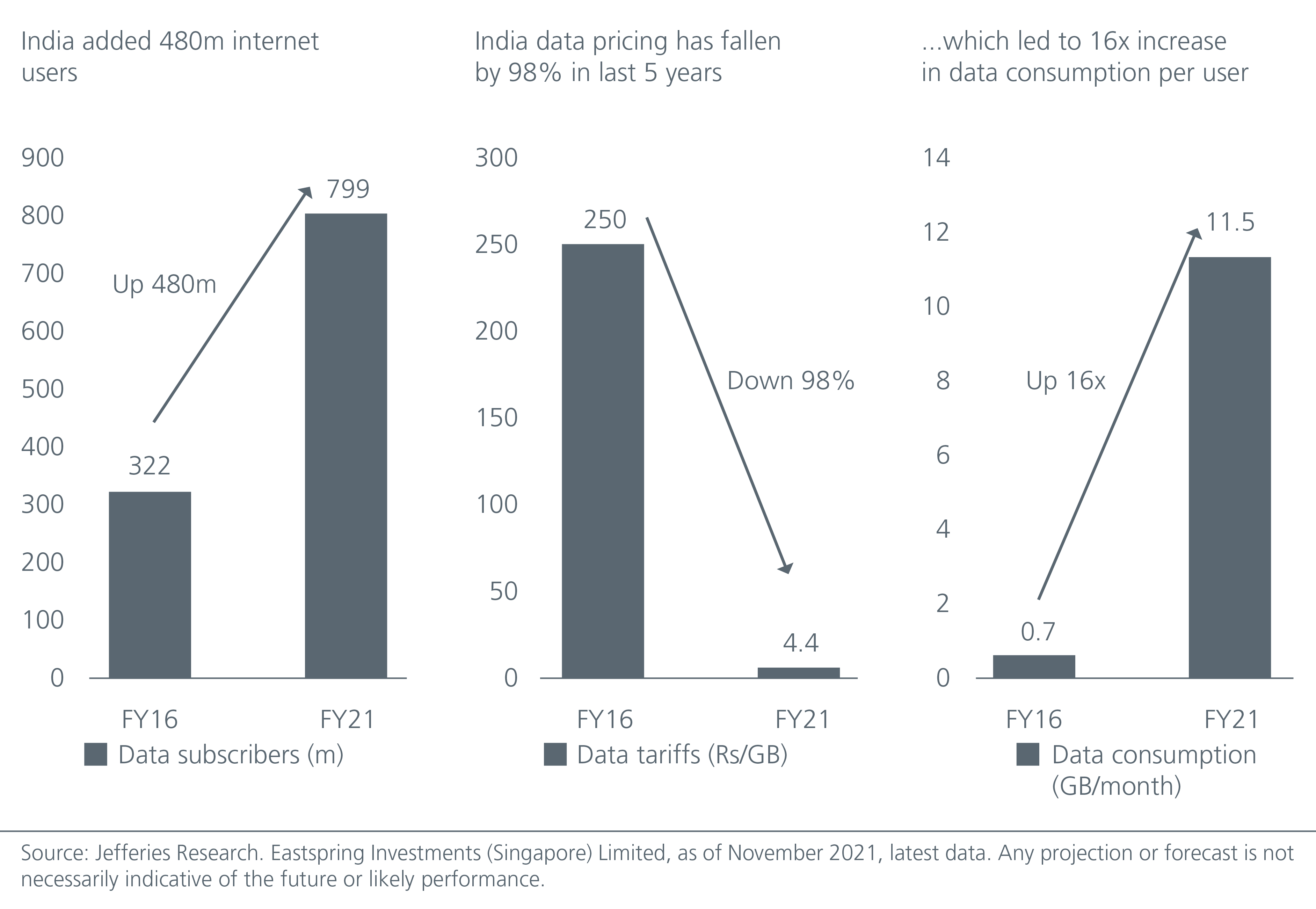 Digitalisation will be an important growth and earnings driver going forward. In the last five years, India added 480 m internet users. Over the same period, data pricing fell by 98%, resulting in a 16-fold increase in data consumption per user. See Fig. 2. The pandemic has also accelerated the adoption of digital channels in many sectors. Digitalisation will bring about productivity gains, supporting economic growth. It will allow companies for example to expand their distribution networks in tier 3 cities quickly and with lower costs. This can in turn lead to higher revenues and better margins. Ongoing digitalisation also enables new sectors such as ed-tech, fintech, e-commerce, creating more jobs. At the same time, with digitalisation, the government should see a more efficient execution of social schemes, and hence less leakages.