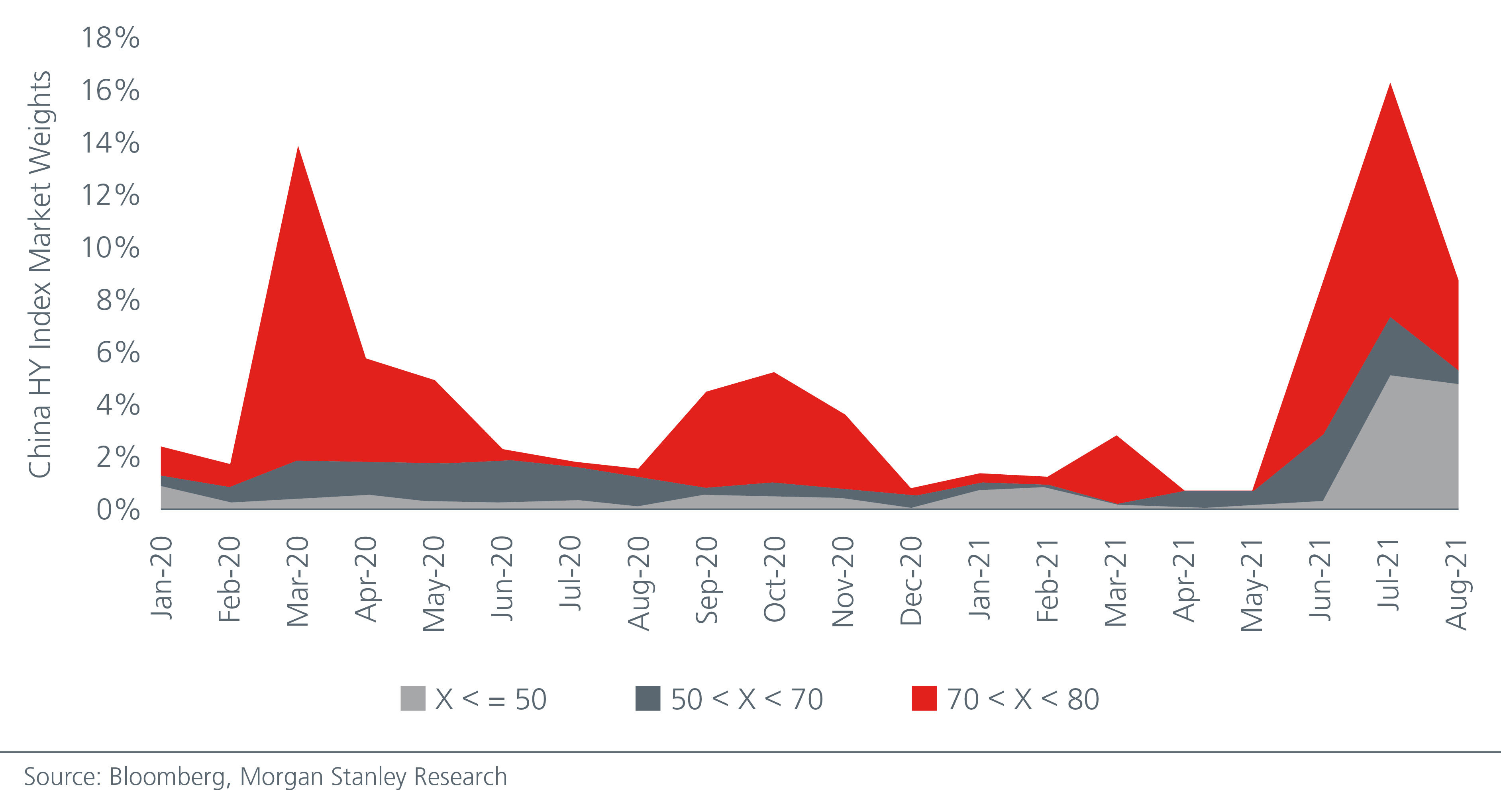 Although investors may expect higher default rates in the Asian High Yield bond market going forward, we believe that opportunities exist for the discerning investor. In China’s High Yield bond market, the percentage of bonds trading below fifty cents to the dollar has risen sharply in recent months. See Fig. 2.